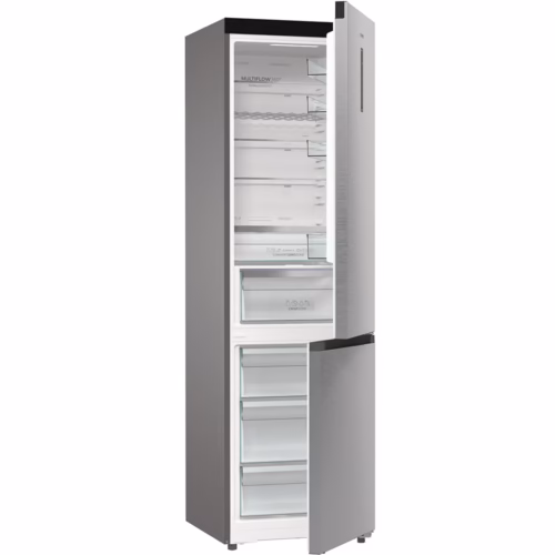 Rafturile sunt ajustabile, oferind flexibilitate în organizare. Compartimentul pentru legume și fructe este generos, iar suportul pentru sticle este util pentru economisirea spațiului.